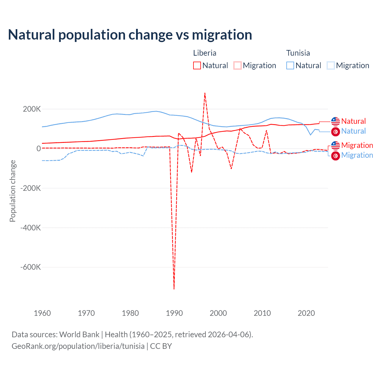 Over the last 10 years, 87.7% of the population change in Liberia is from natural causes (a gain of 1,202,387 people) and 12.3% is from migration (a loss of 168,316 people). In Tunisia 86.3% is from natural causes (a gain of 1,225,079 people) and 13.7% is from migration (a loss of 195,011 people).
