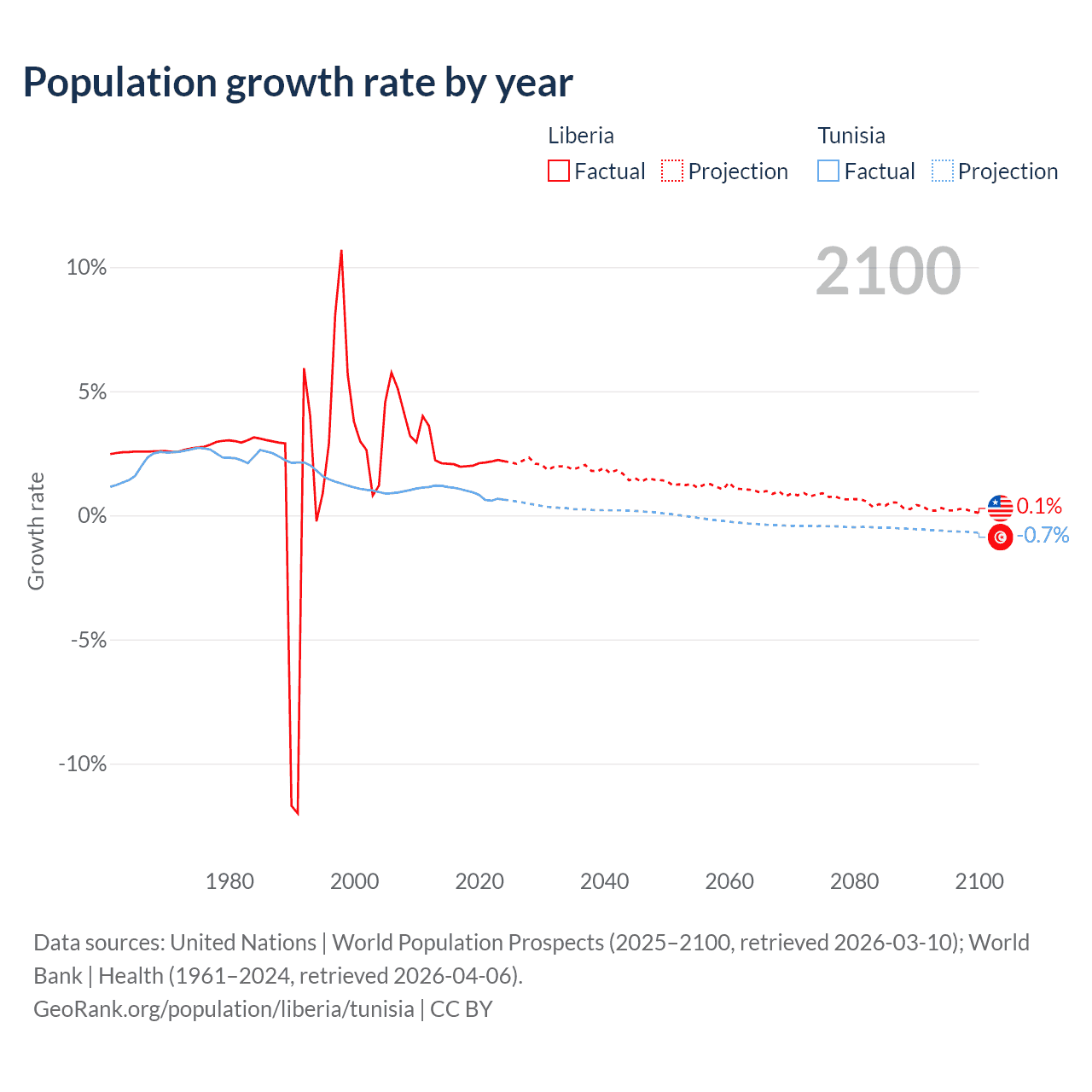 - For the last 10 years, Liberia has had an average growth rate of +2.09% per year vs +0.89% in Tunisia.