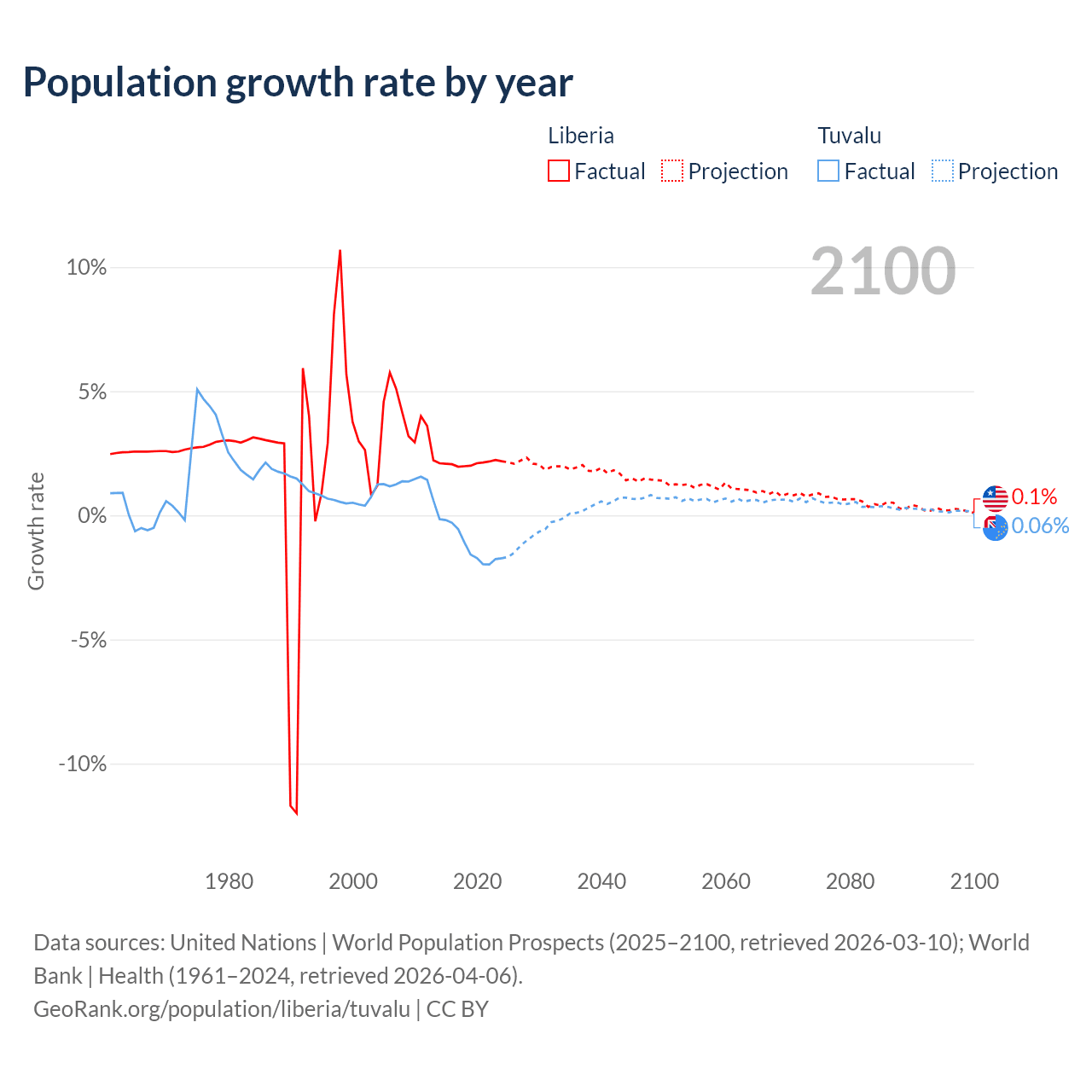 - For the last 10 years, Liberia has had an average growth rate of +2.09% per year vs -1.19% in Tuvalu.