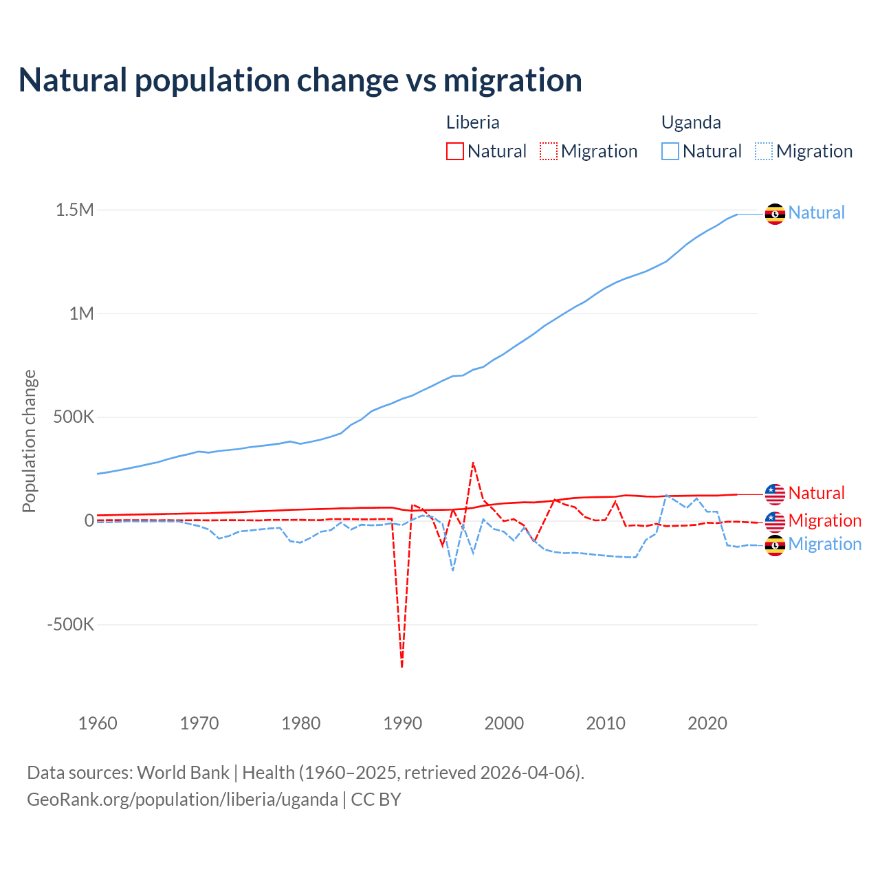 Over the last 10 years, 87.7% of the population change in Liberia is from natural causes (a gain of 1,202,387 people) and 12.3% is from migration (a loss of 168,316 people). In Uganda 99.5% is from natural causes (a gain of 13,419,712 people) and 0.53% is from migration (a gain of 71,457 people).