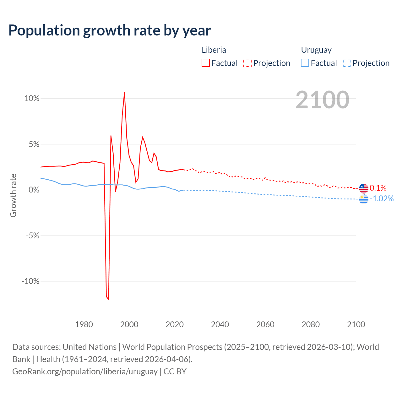 - For the last 10 years, Liberia has had an average growth rate of +2.09% per year vs +0.11% in Uruguay.