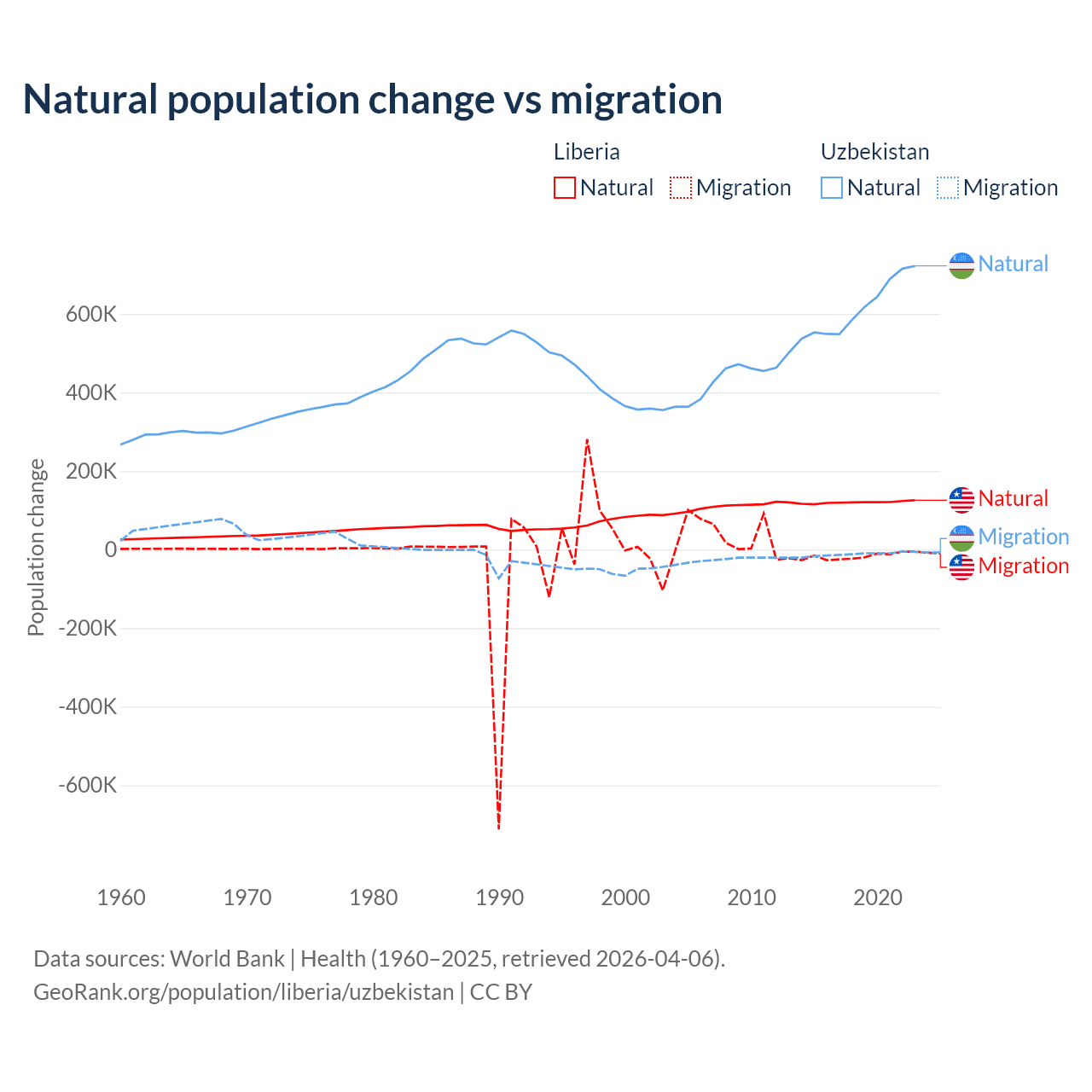 Over the last 10 years, 87.7% of the population change in Liberia is from natural causes (a gain of 1,202,387 people) and 12.3% is from migration (a loss of 168,316 people). In Uzbekistan 98.2% is from natural causes (a gain of 6,161,117 people) and 1.84% is from migration (a loss of 115,398 people).
