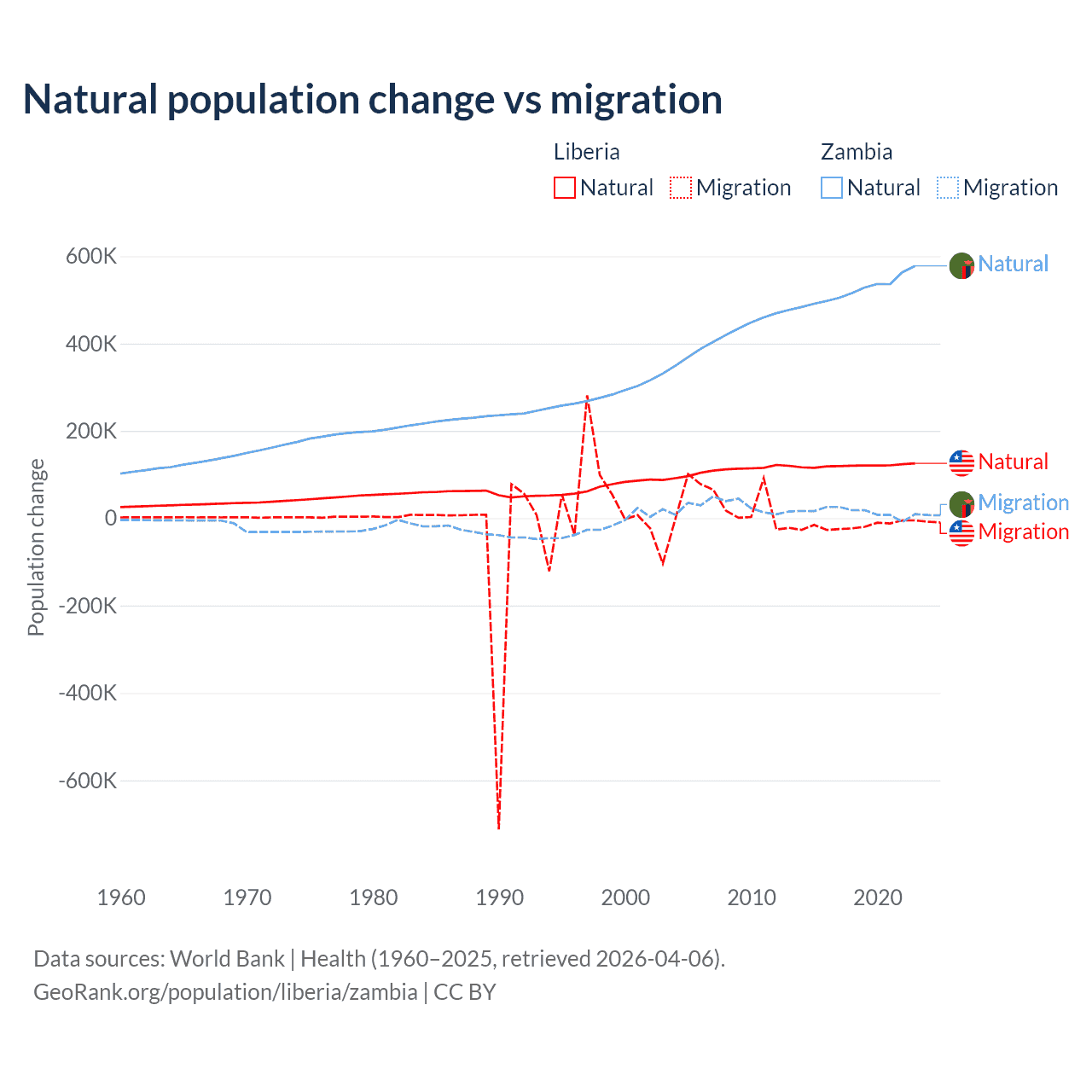 Over the last 10 years, 87.7% of the population change in Liberia is from natural causes (a gain of 1,202,387 people) and 12.3% is from migration (a loss of 168,316 people). In Zambia 97.4% is from natural causes (a gain of 5,233,797 people) and 2.58% is from migration (a gain of 138,554 people).
