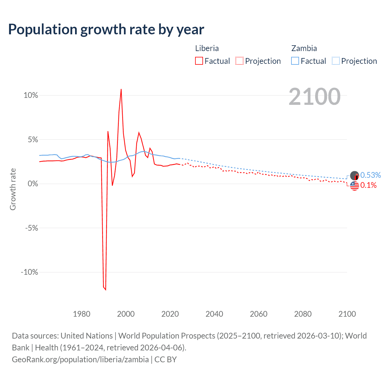 - For the last 10 years, Liberia has had an average growth rate of +2.09% per year vs +3% in Zambia.