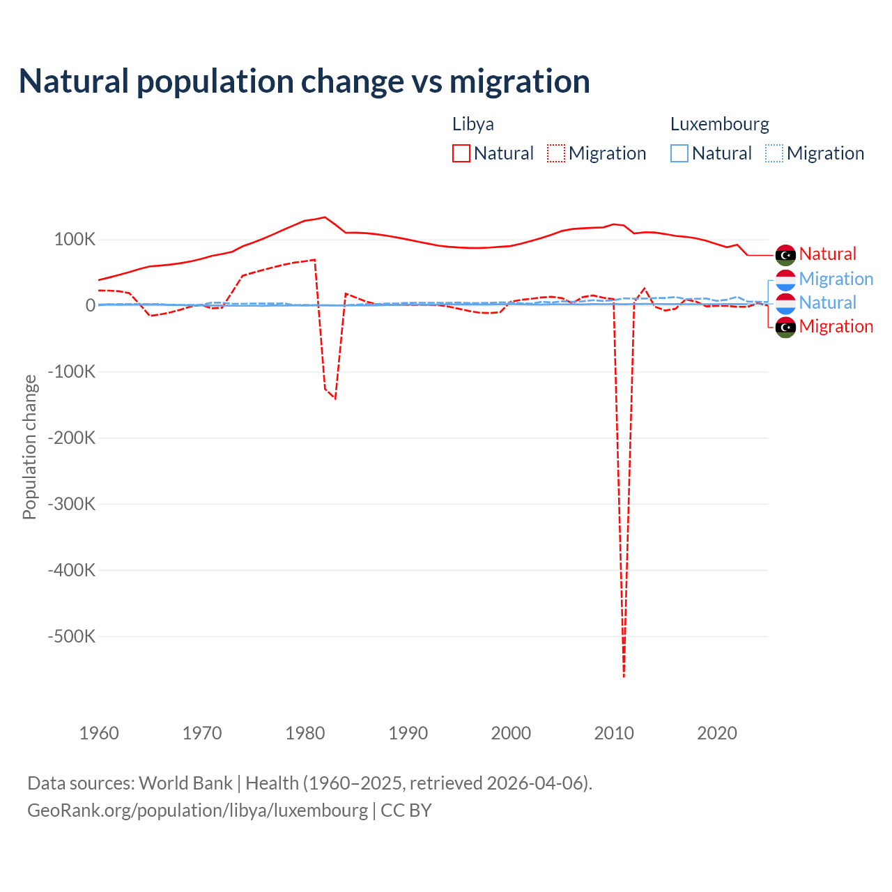 Over the last 10 years, 99.4% of the population change in Libya is from natural causes (a gain of 975,799 people) and 0.63% is from migration (a loss of 6,150 people). In Luxembourg 16.8% is from natural causes (a gain of 20,287 people) and 83.2% is from migration (a gain of 100,435 people).