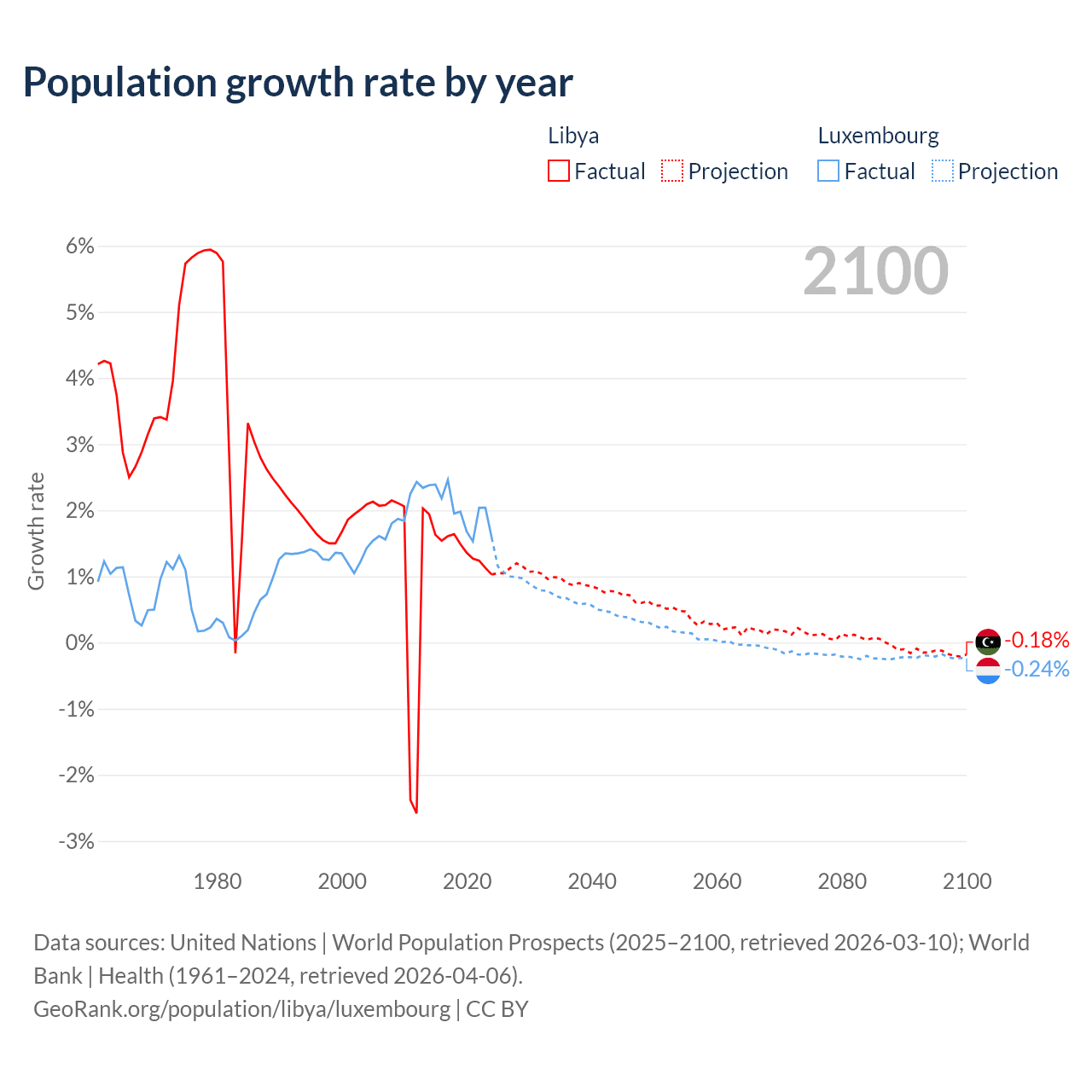 - For the last 10 years, Libya has had an average growth rate of +1.44% per year vs +2.02% in Luxembourg.
