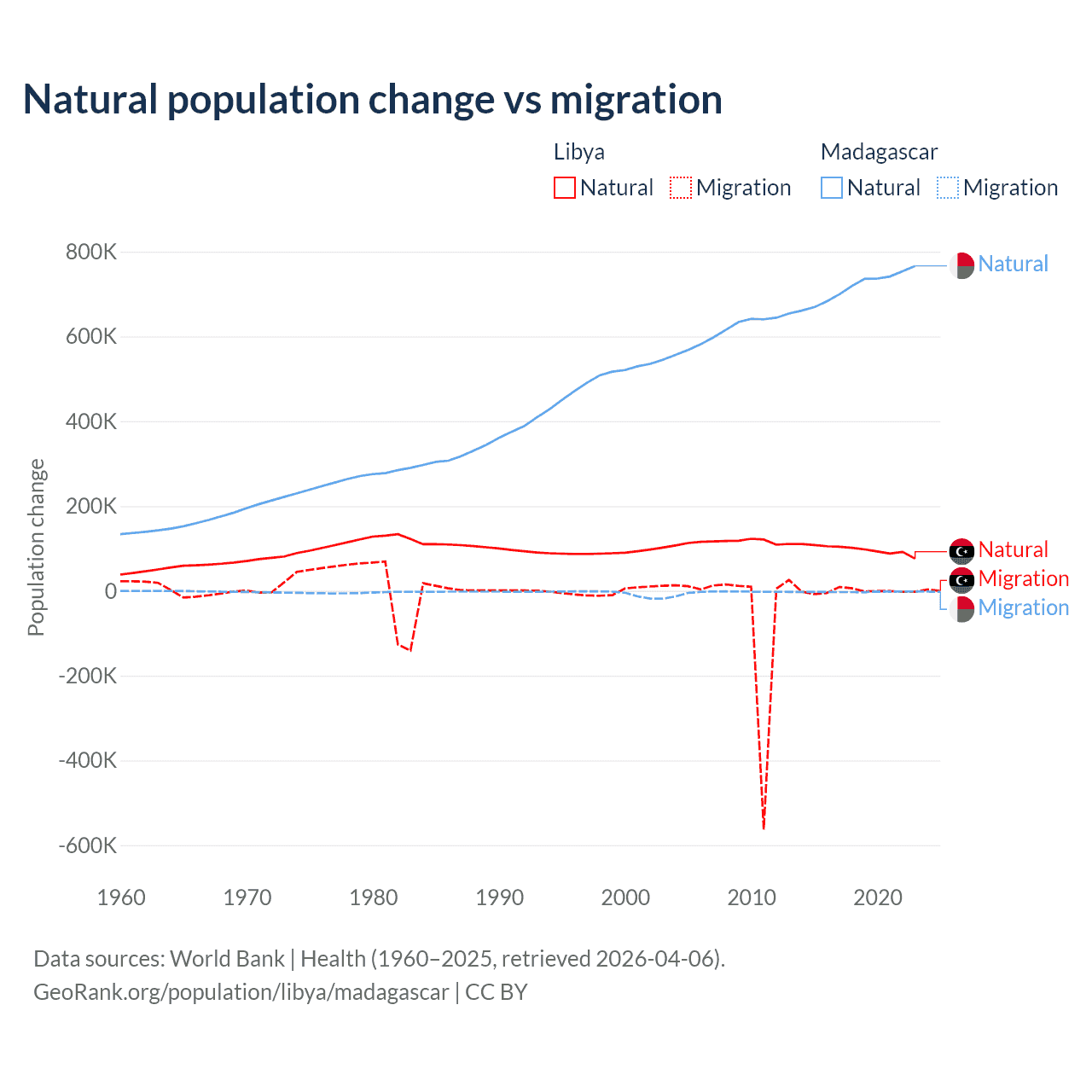 Over the last 10 years, 99.4% of the population change in Libya is from natural causes (a gain of 975,799 people) and 0.63% is from migration (a loss of 6,150 people). In Madagascar 99.7% is from natural causes (a gain of 7,165,578 people) and 0.31% is from migration (a loss of 22,384 people).