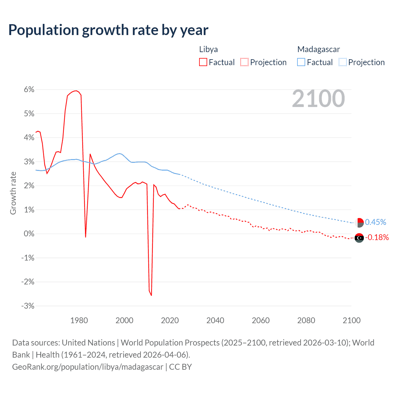 - For the last 10 years, Libya has had an average growth rate of +1.44% per year vs +2.6% in Madagascar.