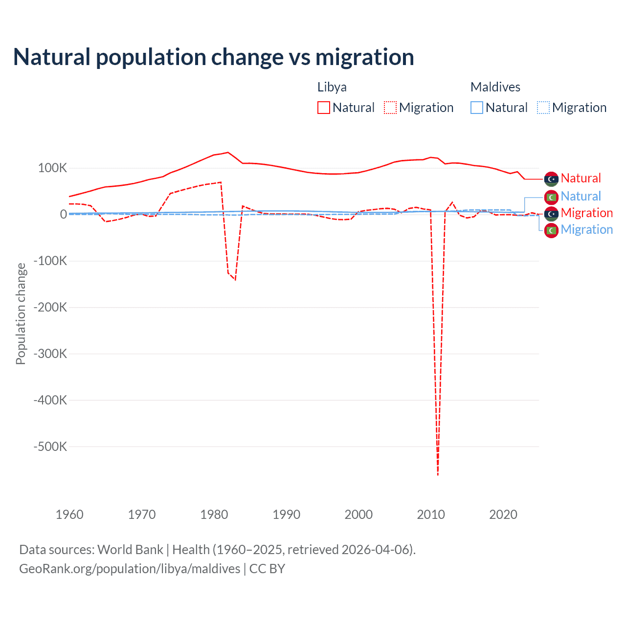 Over the last 10 years, 99.4% of the population change in Libya is from natural causes (a gain of 975,799 people) and 0.63% is from migration (a loss of 6,150 people). In Maldives 42.7% is from natural causes (a gain of 51,342 people) and 57.3% is from migration (a gain of 68,788 people).