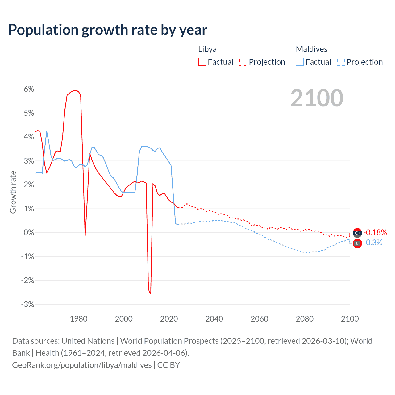 - For the last 10 years, Libya has had an average growth rate of +1.44% per year vs +2.56% in Maldives.
