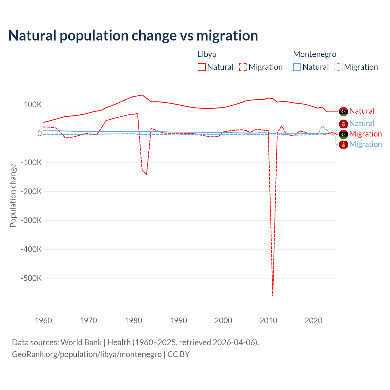 Over the last 10 years, 99.4% of the population change in Libya is from natural causes (a gain of 975,799 people) and 0.63% is from migration (a loss of 6,150 people). In Montenegro 52.4% is from natural causes (a gain of 4,501 people) and 47.6% is from migration (a gain of 4,095 people).