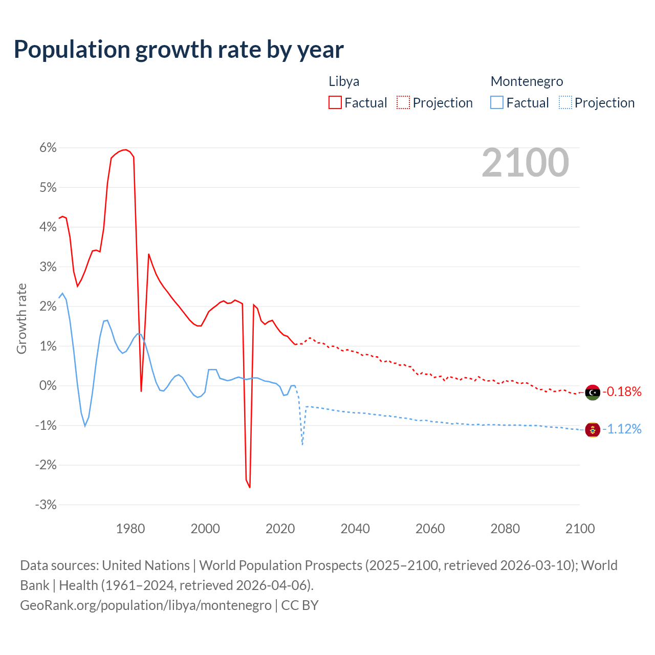 - For the last 10 years, Libya has had an average growth rate of +1.44% per year vs +0.01% in Montenegro.