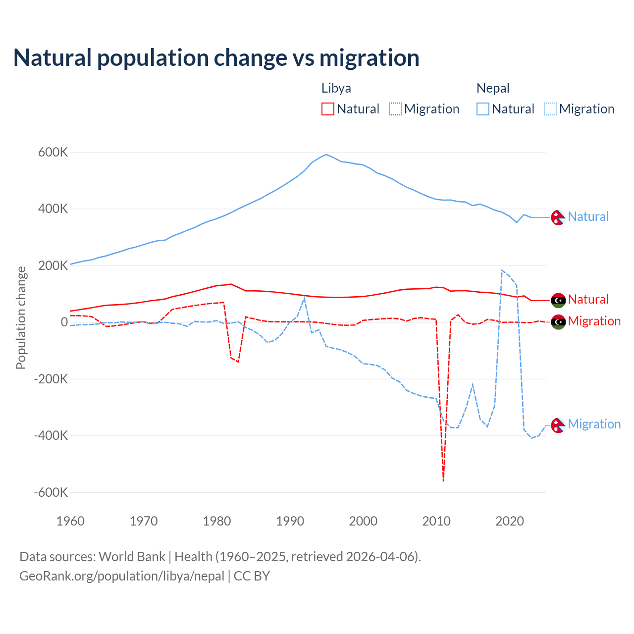 Over the last 10 years, 99.4% of the population change in Libya is from natural causes (a gain of 975,799 people) and 0.63% is from migration (a loss of 6,150 people). In Nepal 67.9% is from natural causes (a gain of 3,909,749 people) and 32.1% is from migration (a loss of 1,851,664 people).