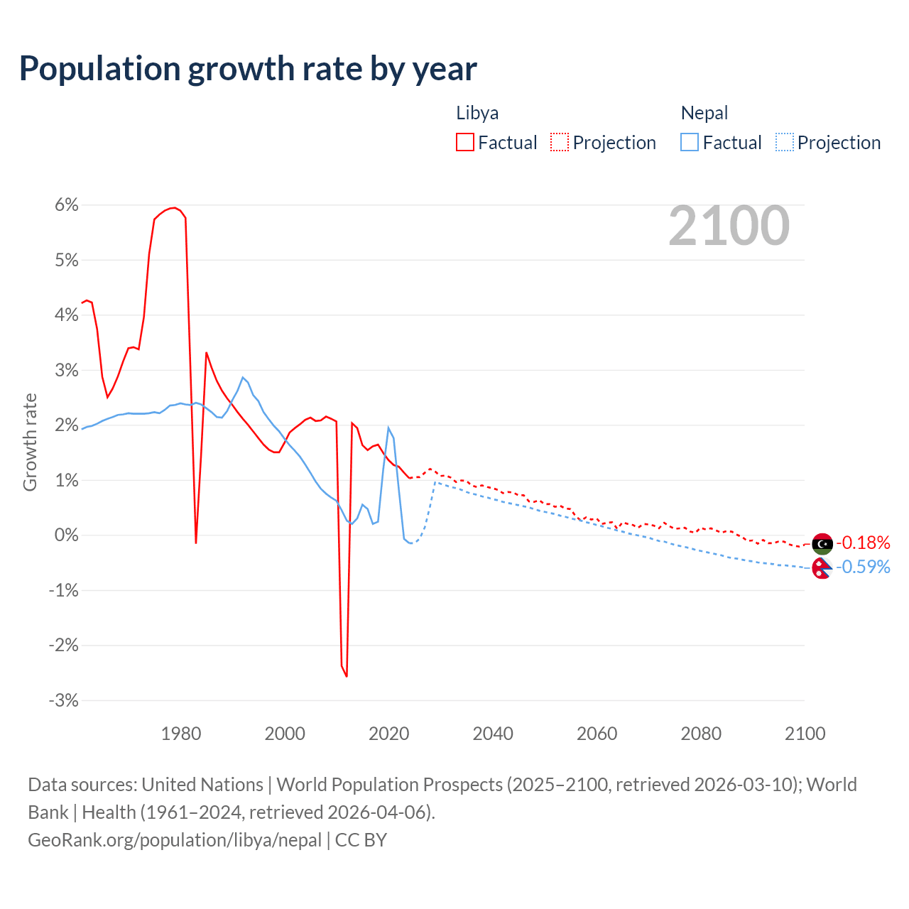 - For the last 10 years, Libya has had an average growth rate of +1.44% per year vs +0.66% in Nepal.