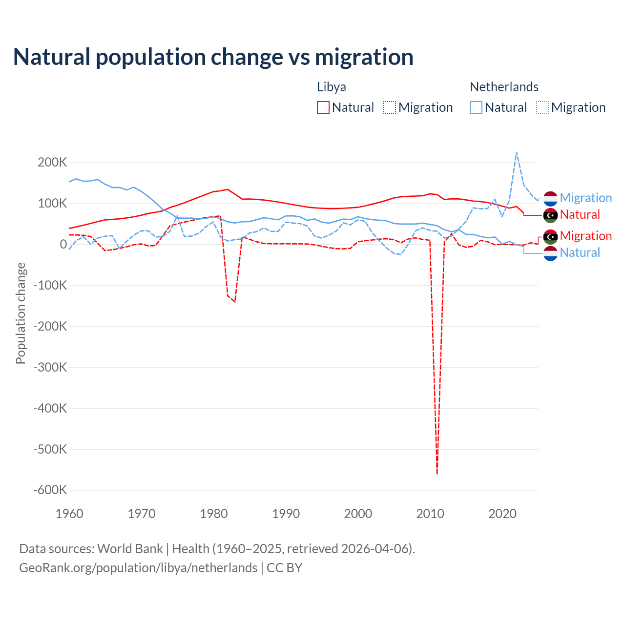 Over the last 10 years, 99.4% of the population change in Libya is from natural causes (a gain of 975,799 people) and 0.63% is from migration (a loss of 6,150 people). In the Netherlands 11.8% is from natural causes (a gain of 134,554 people) and 88.2% is from migration (a gain of 1,006,495 people).