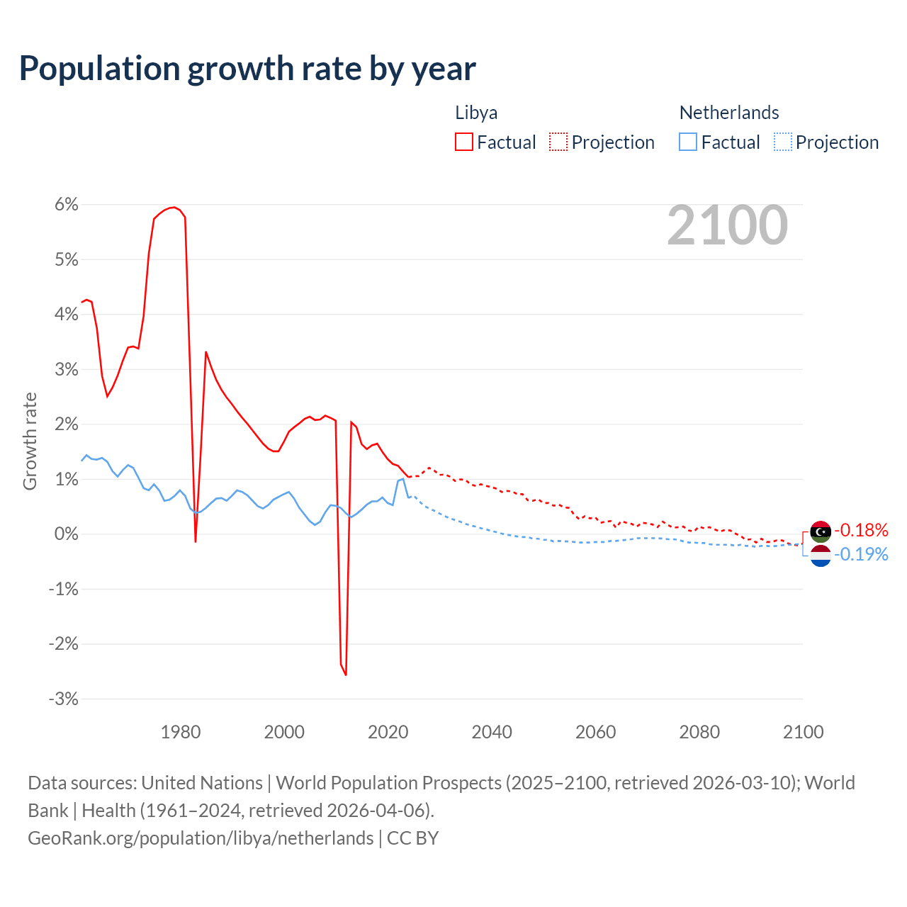 - For the last 10 years, Libya has had an average growth rate of +1.44% per year vs +0.62% in the Netherlands.