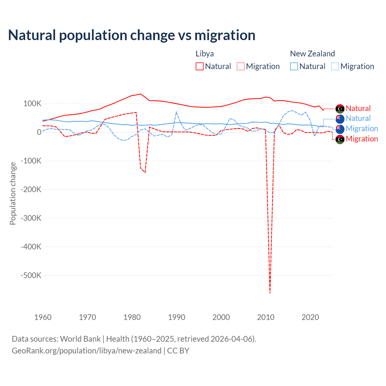 Over the last 10 years, 99.4% of the population change in Libya is from natural causes (a gain of 975,799 people) and 0.63% is from migration (a loss of 6,150 people). In New Zealand 34.4% is from natural causes (a gain of 247,767 people) and 65.6% is from migration (a gain of 471,602 people).