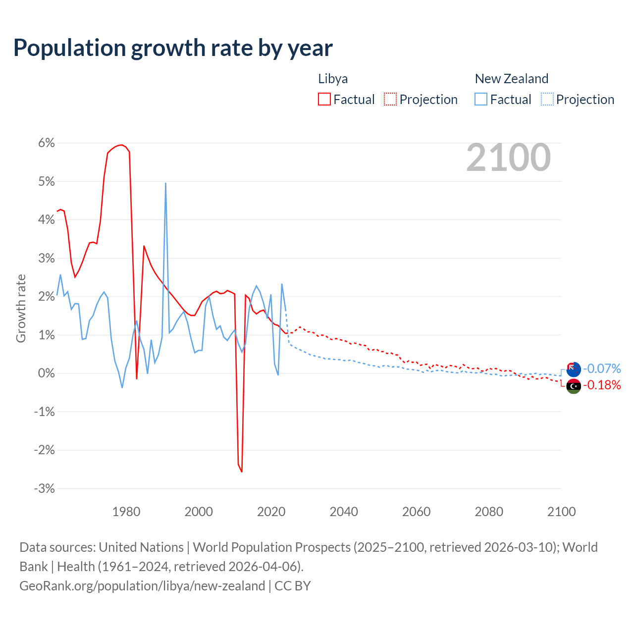 - For the last 10 years, Libya has had an average growth rate of +1.44% per year vs +1.6% in New Zealand.
