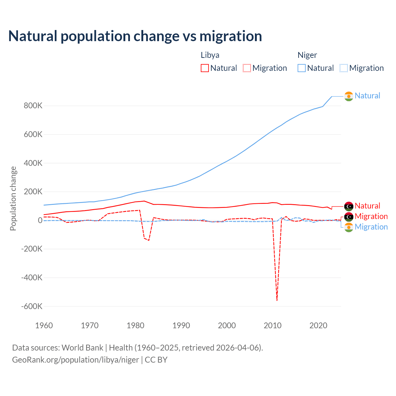 Over the last 10 years, 99.4% of the population change in Libya is from natural causes (a gain of 975,799 people) and 0.63% is from migration (a loss of 6,150 people). In Niger 100% is from natural causes (a gain of 7,728,287 people) and 0.03% is from migration (a gain of 2,520 people).