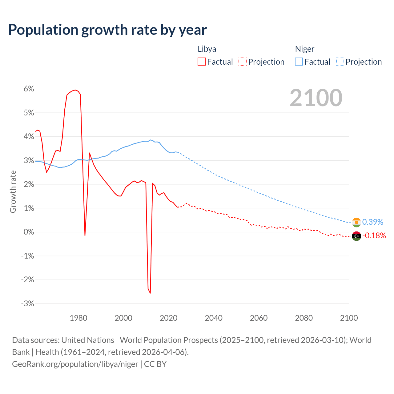 - For the last 10 years, Libya has had an average growth rate of +1.44% per year vs +3.5% in Niger.