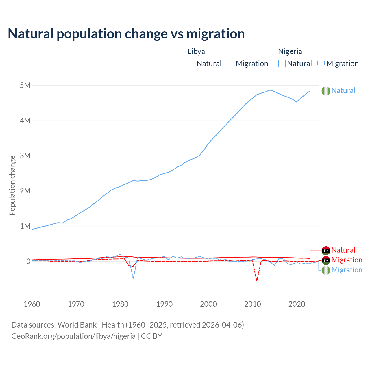 Over the last 10 years, 99.4% of the population change in Libya is from natural causes (a gain of 975,799 people) and 0.63% is from migration (a loss of 6,150 people). In Nigeria 99.2% is from natural causes (a gain of 47,163,517 people) and 0.77% is from migration (a loss of 368,103 people).