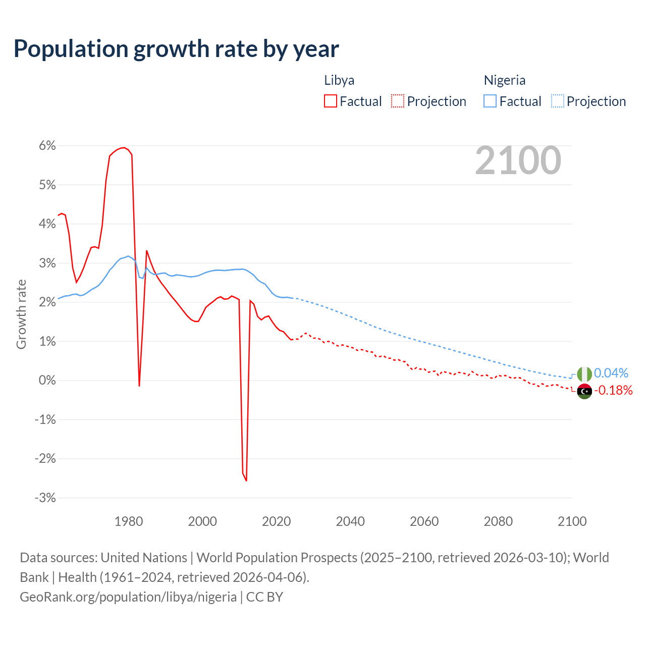 - For the last 10 years, Libya has had an average growth rate of +1.44% per year vs +2.31% in Nigeria.