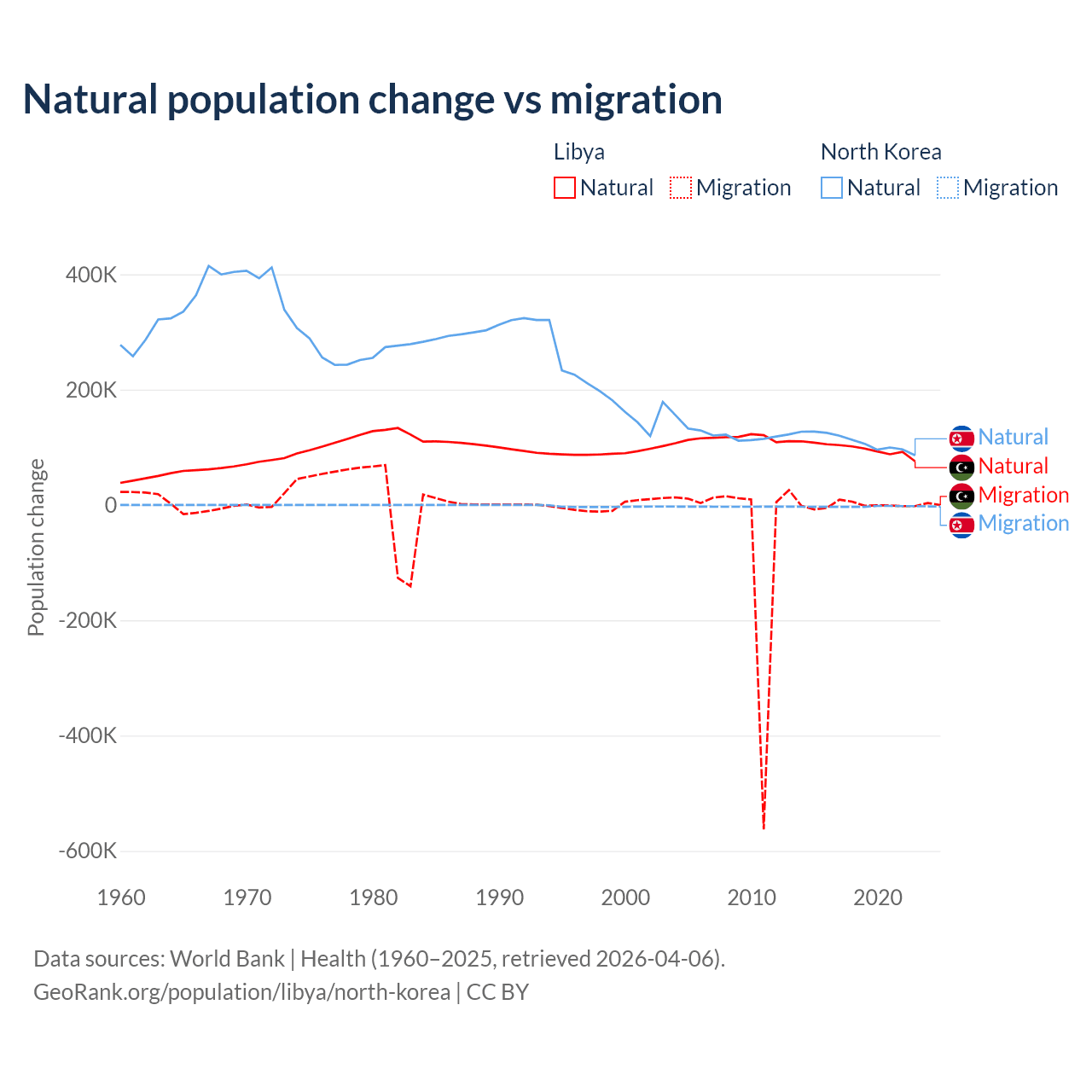 Over the last 10 years, 99.4% of the population change in Libya is from natural causes (a gain of 975,799 people) and 0.63% is from migration (a loss of 6,150 people). In North Korea 97.7% is from natural causes (a gain of 1,097,372 people) and 2.33% is from migration (a loss of 26,227 people).