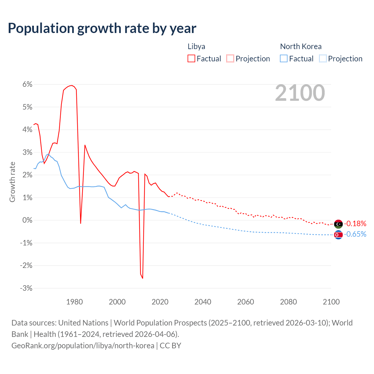 - For the last 10 years, Libya has had an average growth rate of +1.44% per year vs +0.41% in North Korea.
