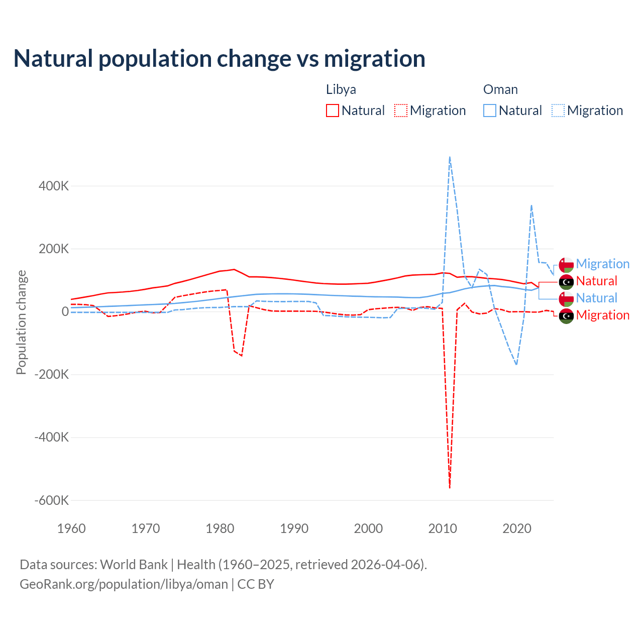 Over the last 10 years, 99.4% of the population change in Libya is from natural causes (a gain of 975,799 people) and 0.63% is from migration (a loss of 6,150 people). In Oman 61.6% is from natural causes (a gain of 763,049 people) and 38.4% is from migration (a gain of 475,565 people).