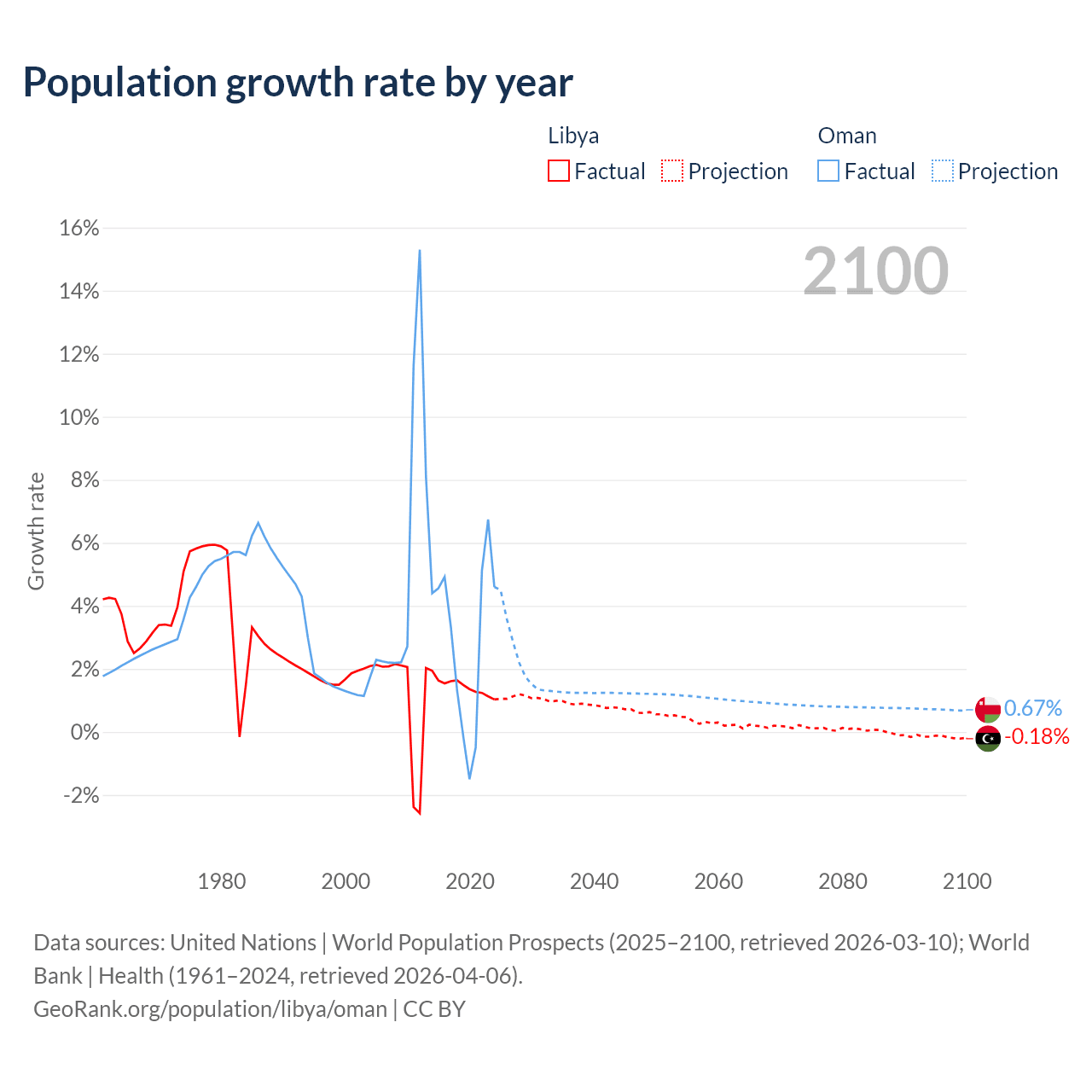 - For the last 10 years, Libya has had an average growth rate of +1.44% per year vs +2.99% in Oman.
