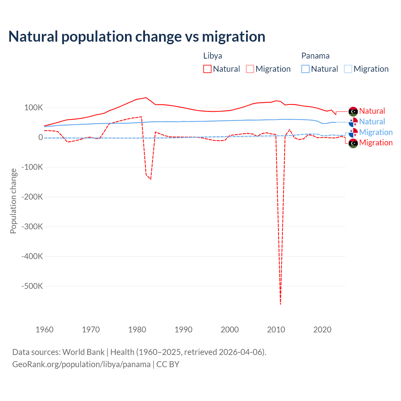 Over the last 10 years, 99.4% of the population change in Libya is from natural causes (a gain of 975,799 people) and 0.63% is from migration (a loss of 6,150 people). In Panama 86.5% is from natural causes (a gain of 544,211 people) and 13.5% is from migration (a gain of 84,849 people).