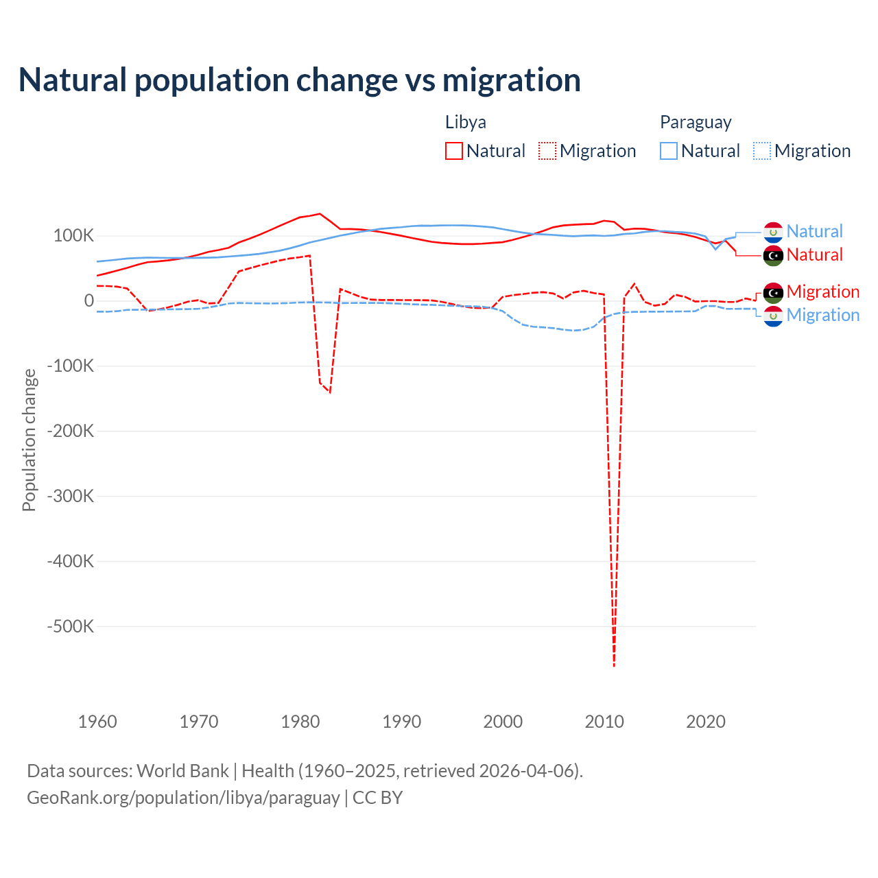 Over the last 10 years, 99.4% of the population change in Libya is from natural causes (a gain of 975,799 people) and 0.63% is from migration (a loss of 6,150 people). In Paraguay 87.6% is from natural causes (a gain of 1,002,636 people) and 12.4% is from migration (a loss of 141,377 people).