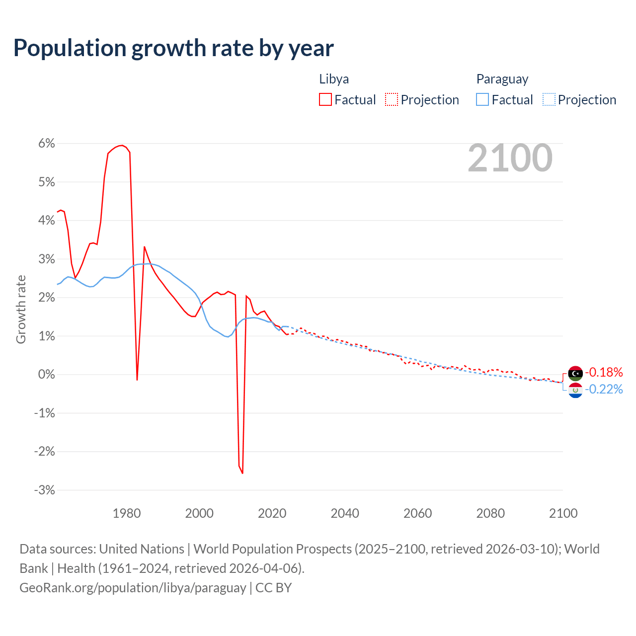 - For the last 10 years, Libya has had an average growth rate of +1.44% per year vs +1.34% in Paraguay.