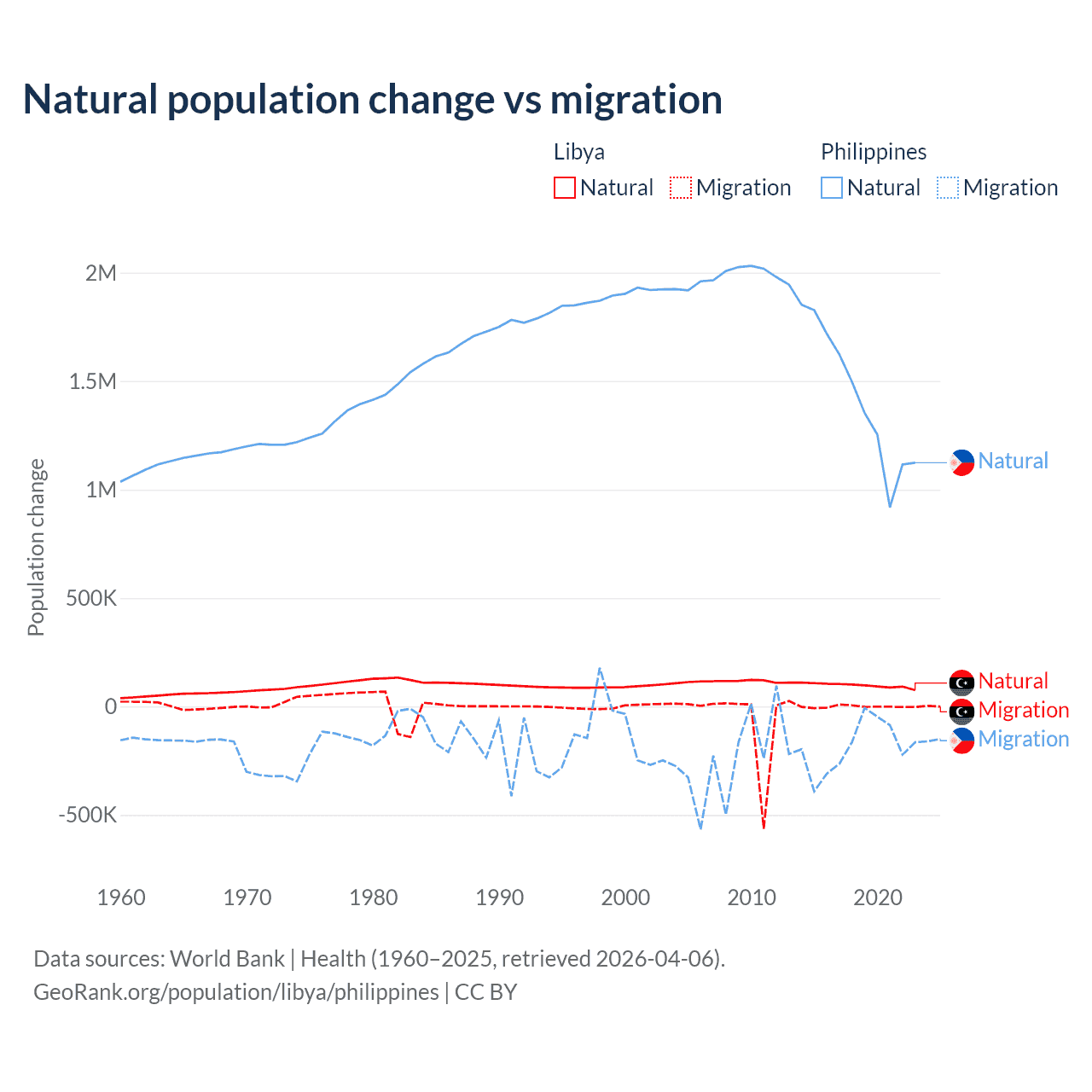 Over the last 10 years, 99.4% of the population change in Libya is from natural causes (a gain of 975,799 people) and 0.63% is from migration (a loss of 6,150 people). In the Philippines 88.5% is from natural causes (a gain of 14,279,705 people) and 11.5% is from migration (a loss of 1,848,117 people).