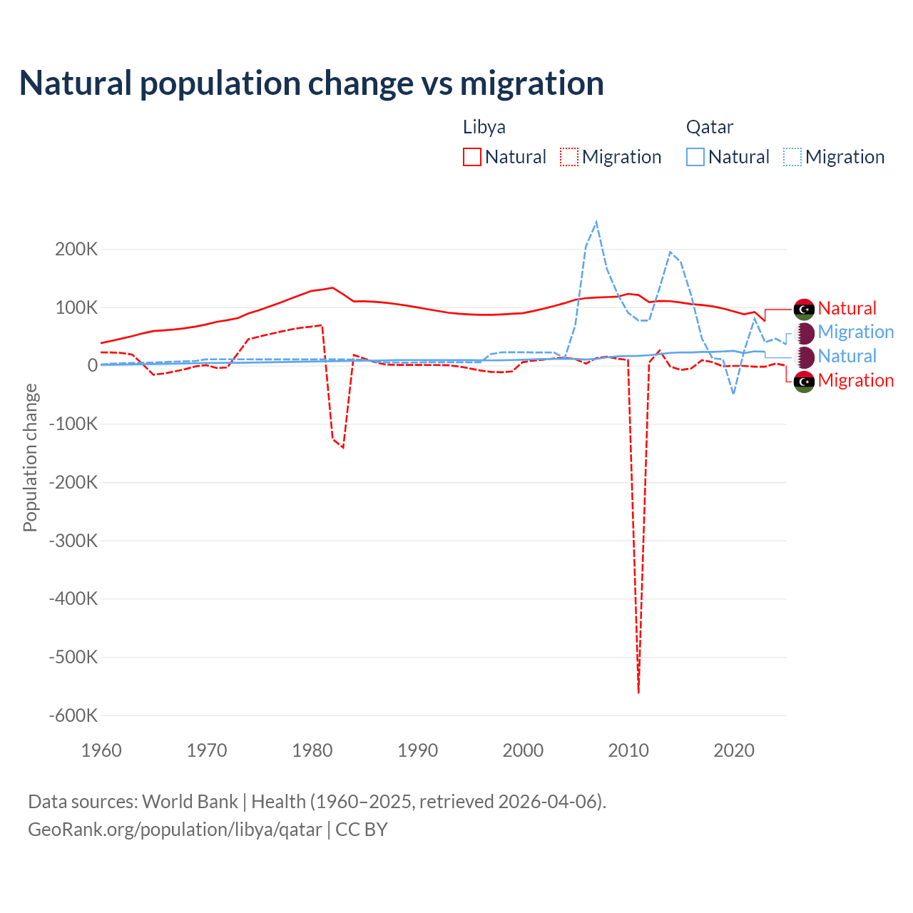 Over the last 10 years, 99.4% of the population change in Libya is from natural causes (a gain of 975,799 people) and 0.63% is from migration (a loss of 6,150 people). In Qatar 26.1% is from natural causes (a gain of 232,009 people) and 73.9% is from migration (a gain of 655,712 people).
