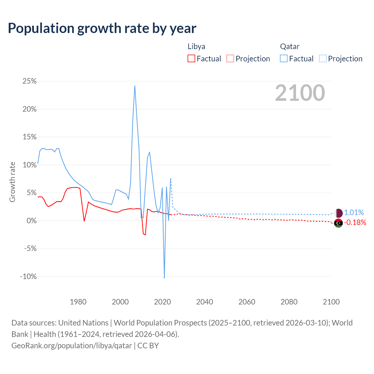 - For the last 10 years, Libya has had an average growth rate of +1.44% per year vs +3.86% in Qatar.