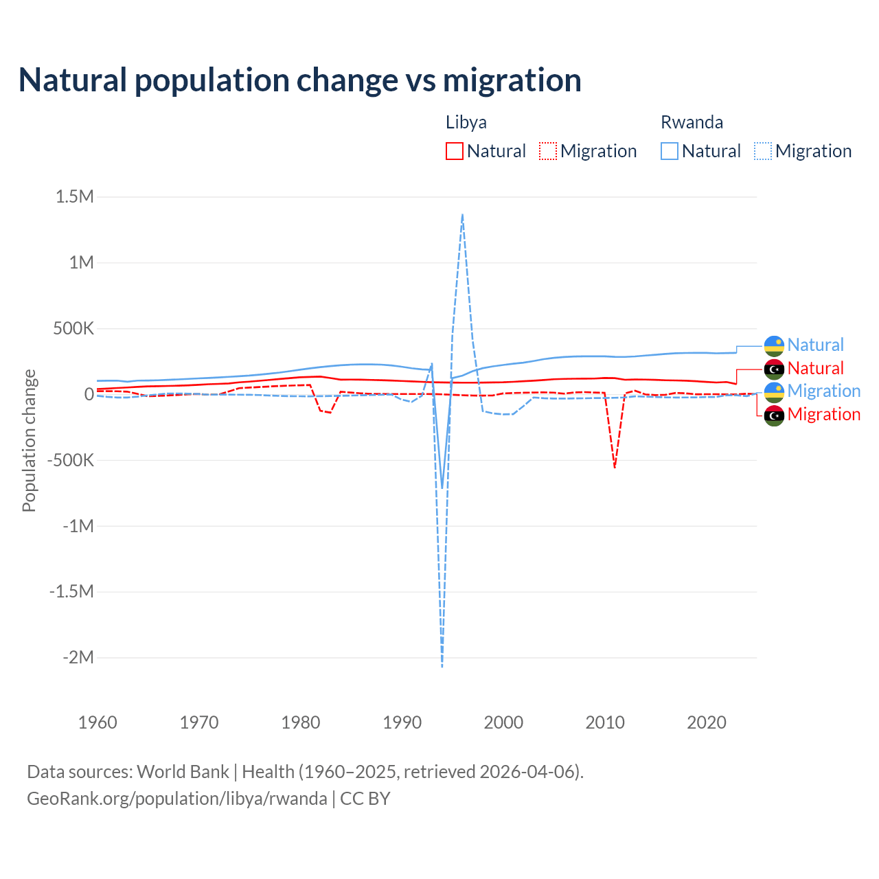 Over the last 10 years, 99.4% of the population change in Libya is from natural causes (a gain of 975,799 people) and 0.63% is from migration (a loss of 6,150 people). In Rwanda 93.8% is from natural causes (a gain of 3,081,296 people) and 6.18% is from migration (a loss of 203,035 people).