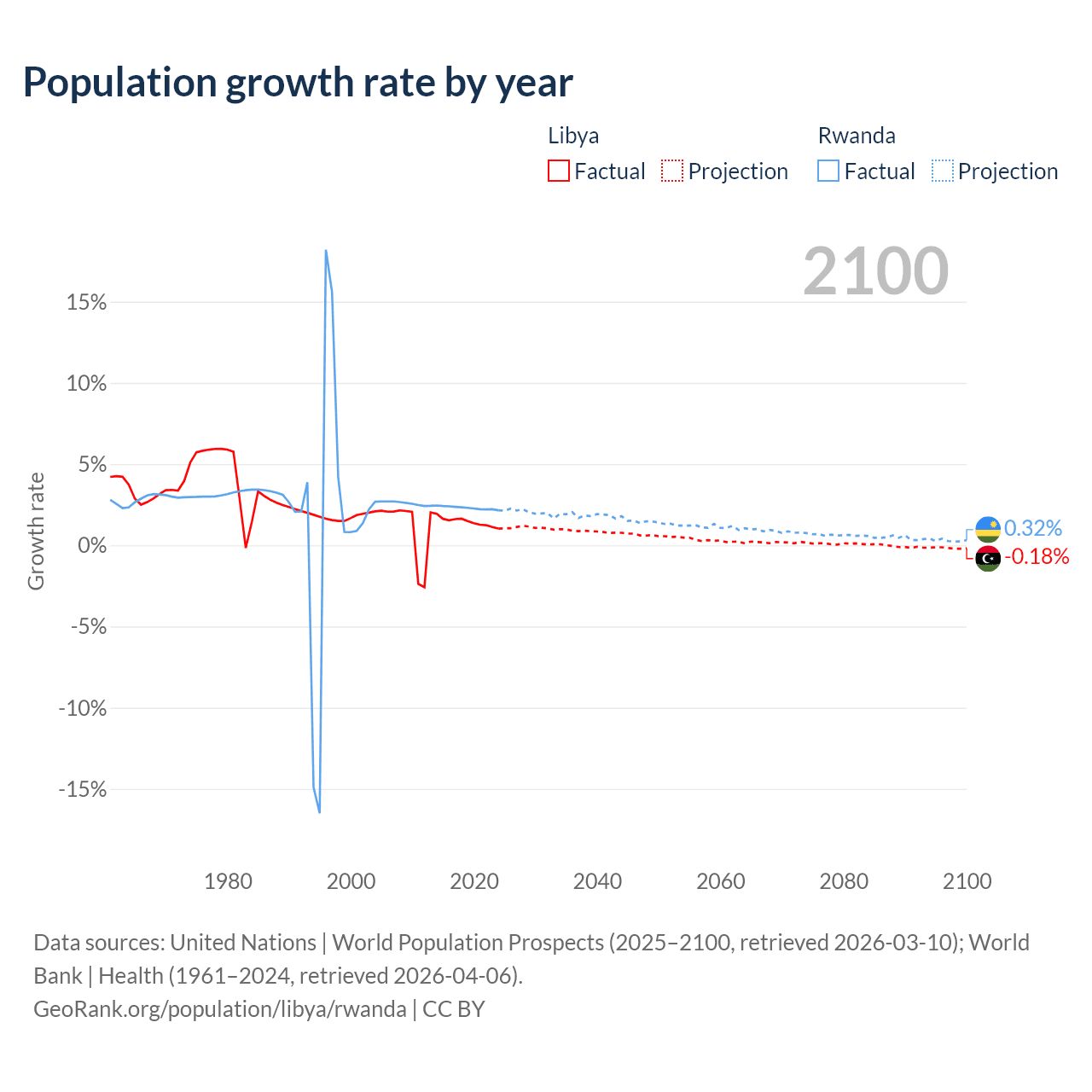 - For the last 10 years, Libya has had an average growth rate of +1.44% per year vs +2.31% in Rwanda.