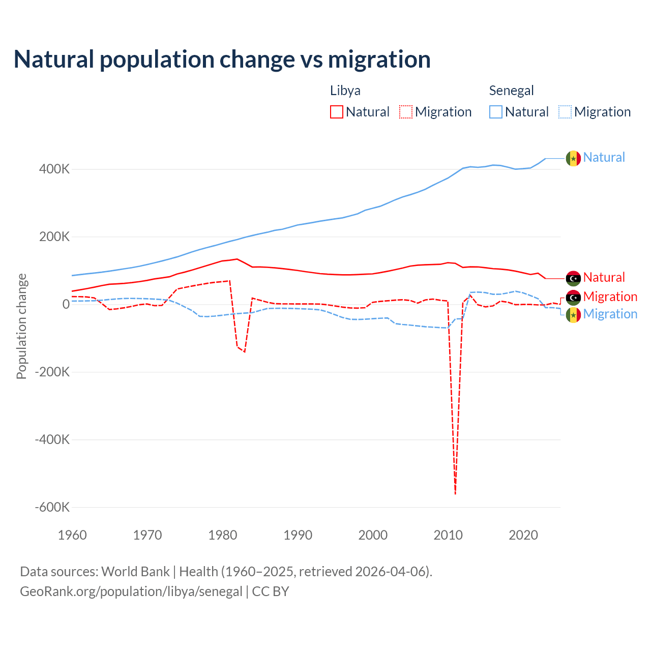 Over the last 10 years, 99.4% of the population change in Libya is from natural causes (a gain of 975,799 people) and 0.63% is from migration (a loss of 6,150 people). In Senegal 93.9% is from natural causes (a gain of 4,089,205 people) and 6.13% is from migration (a gain of 267,266 people).