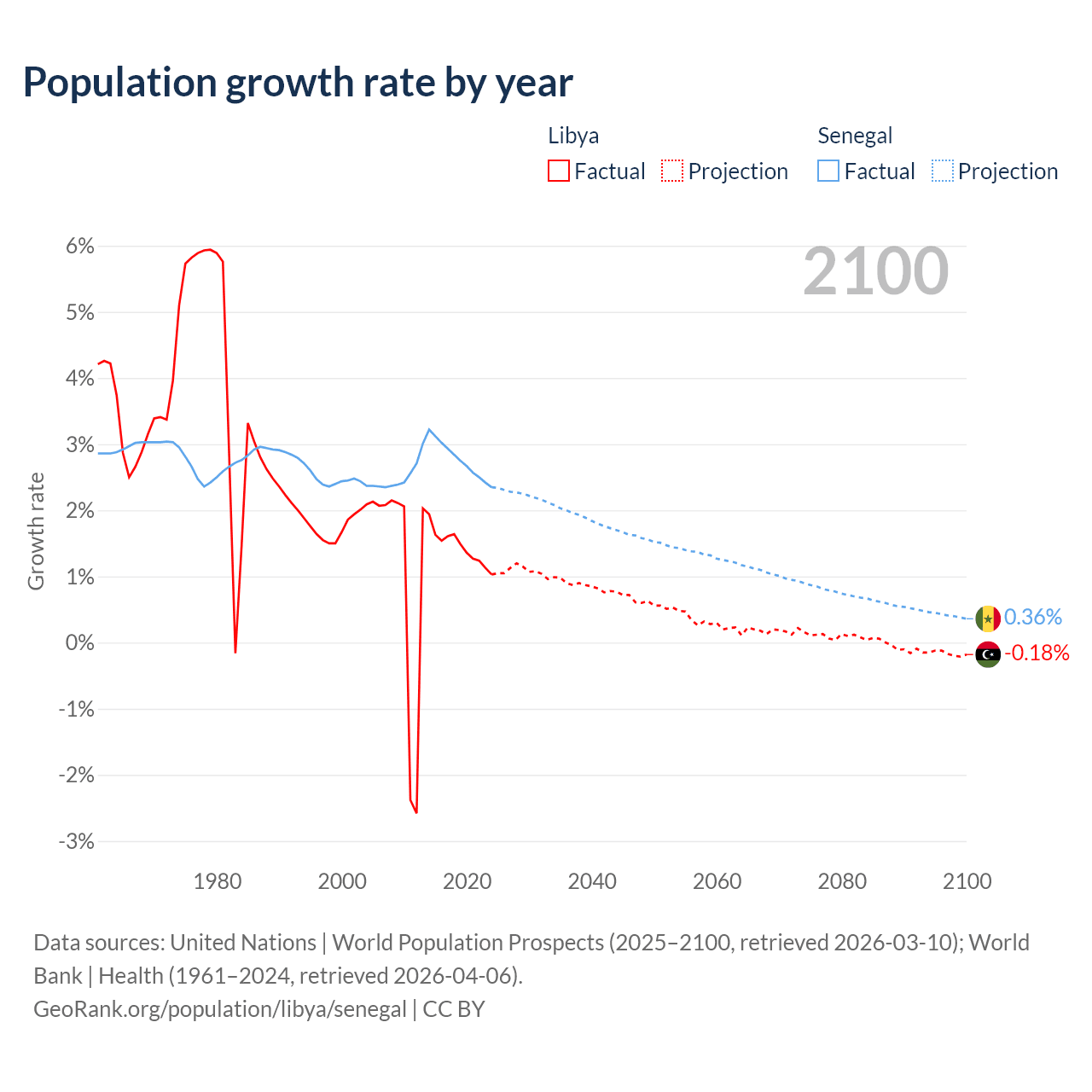 - For the last 10 years, Libya has had an average growth rate of +1.44% per year vs +2.76% in Senegal.