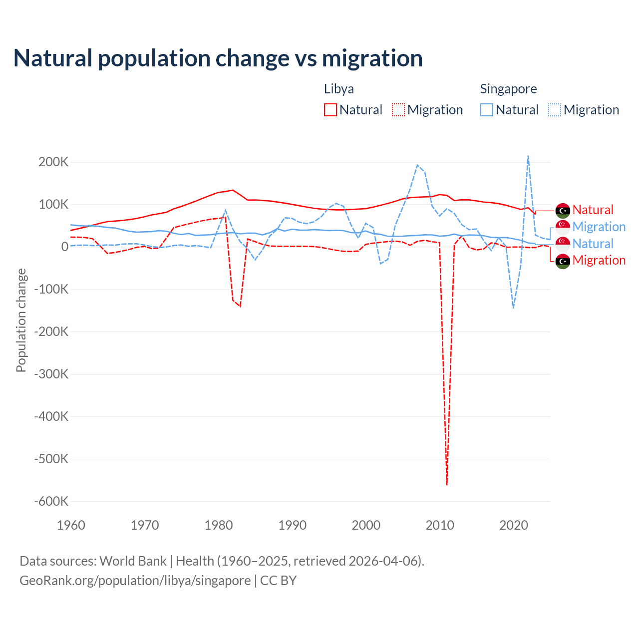Over the last 10 years, 99.4% of the population change in Libya is from natural causes (a gain of 975,799 people) and 0.63% is from migration (a loss of 6,150 people). In Singapore 54.8% is from natural causes (a gain of 195,953 people) and 45.2% is from migration (a gain of 161,805 people).