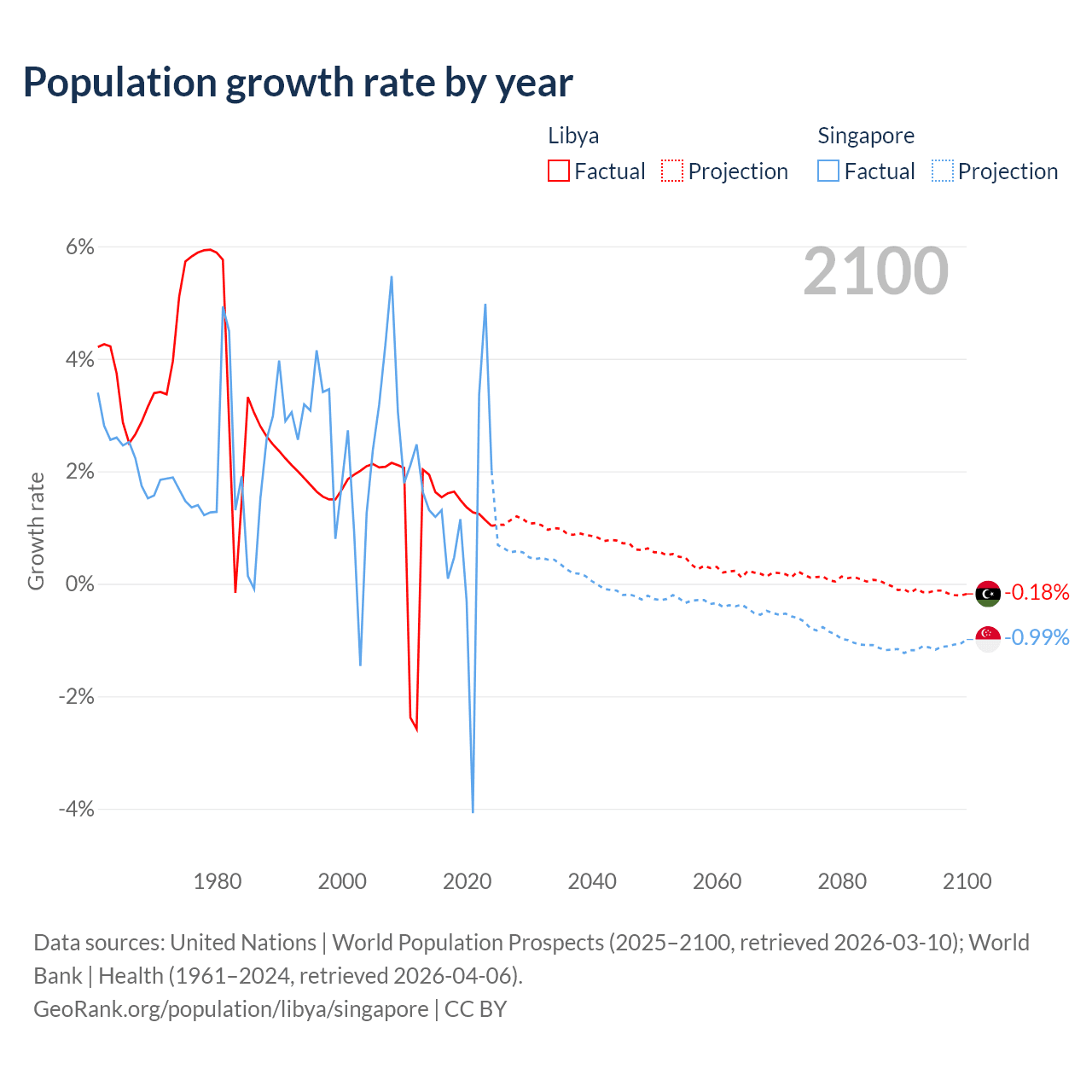 - For the last 10 years, Libya has had an average growth rate of +1.44% per year vs +1.04% in Singapore.