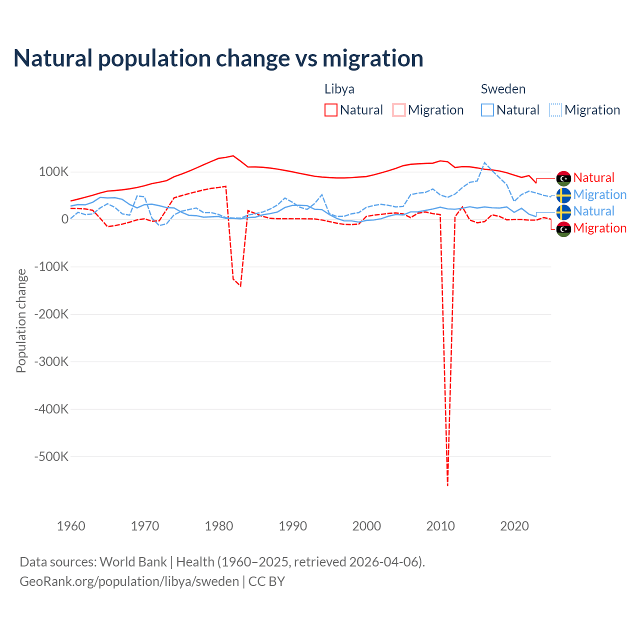 Over the last 10 years, 99.4% of the population change in Libya is from natural causes (a gain of 975,799 people) and 0.63% is from migration (a loss of 6,150 people). In Sweden 21.4% is from natural causes (a gain of 201,900 people) and 78.6% is from migration (a gain of 743,642 people).
