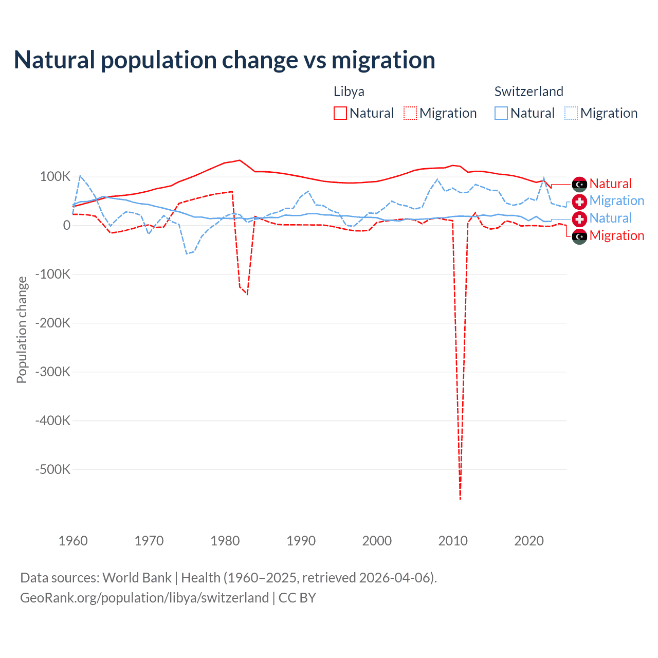 Over the last 10 years, 99.4% of the population change in Libya is from natural causes (a gain of 975,799 people) and 0.63% is from migration (a loss of 6,150 people). In Switzerland 21.6% is from natural causes (a gain of 165,354 people) and 78.4% is from migration (a gain of 600,145 people).