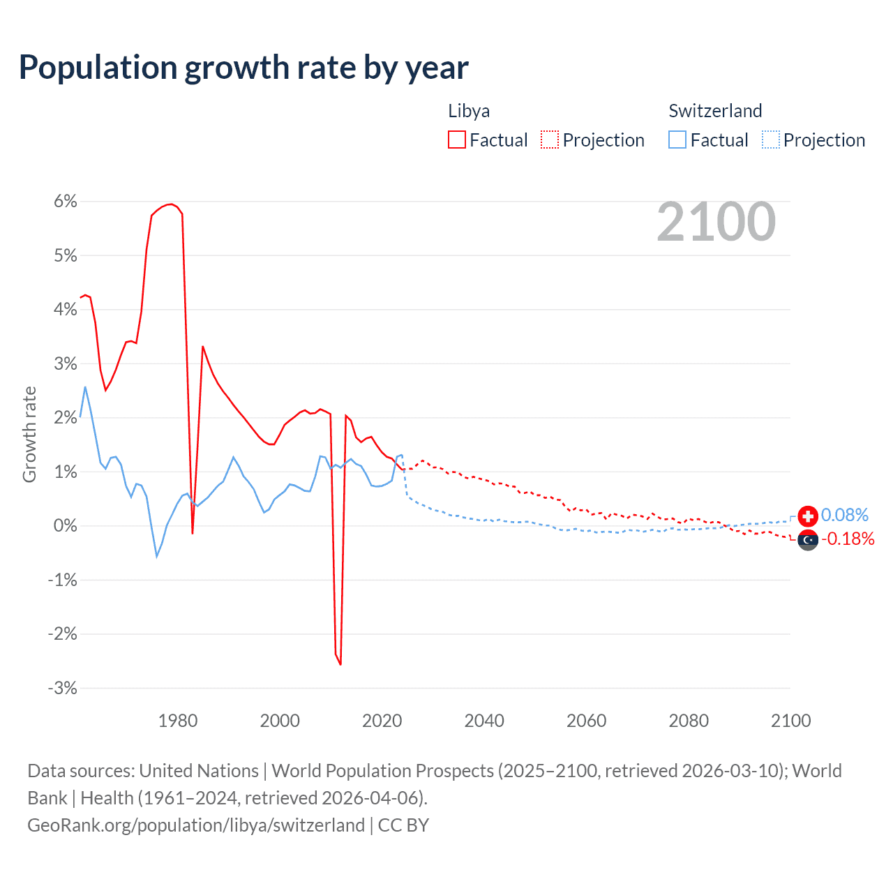 - For the last 10 years, Libya has had an average growth rate of +1.44% per year vs +0.98% in Switzerland.