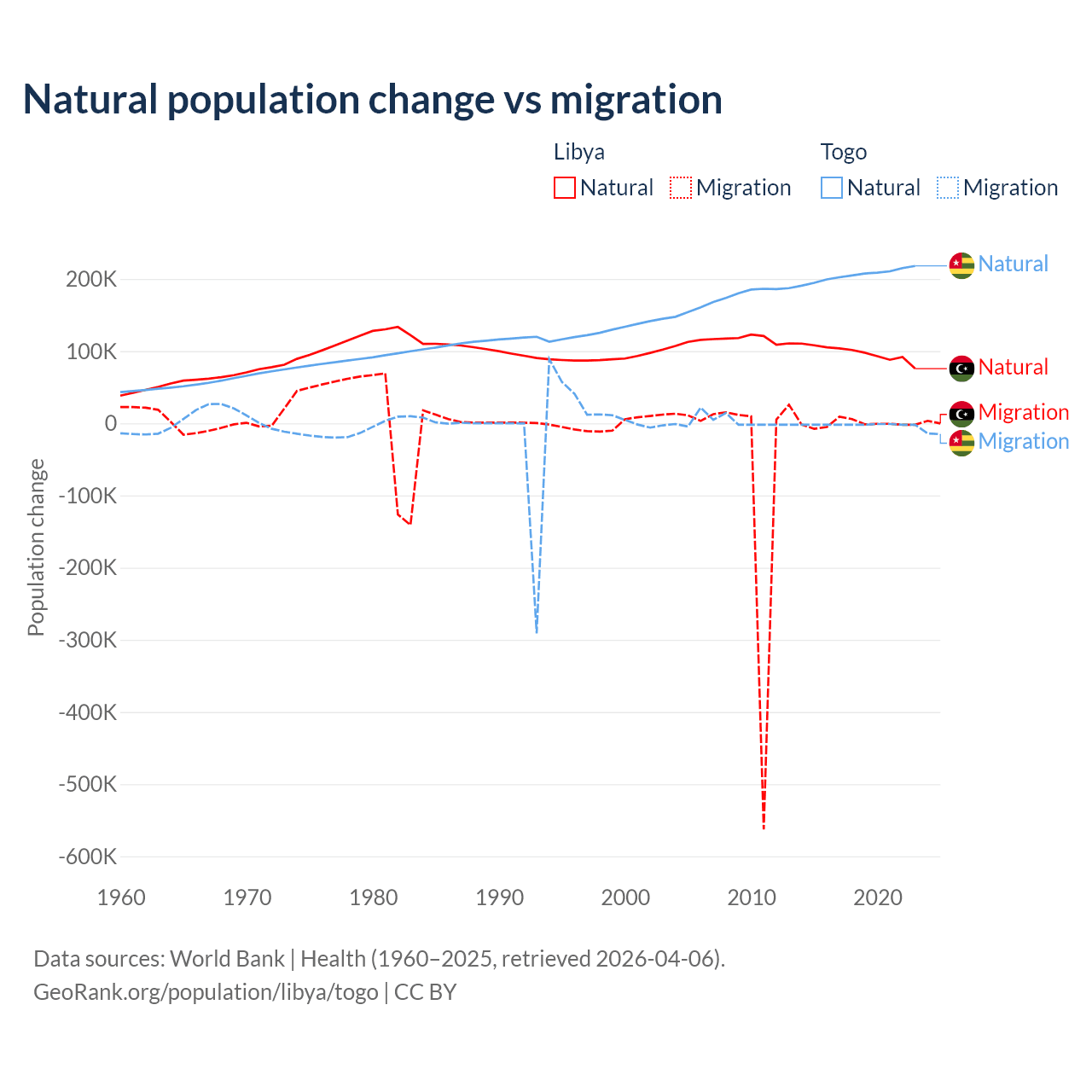 Over the last 10 years, 99.4% of the population change in Libya is from natural causes (a gain of 975,799 people) and 0.63% is from migration (a loss of 6,150 people). In Togo 99.1% is from natural causes (a gain of 2,052,115 people) and 0.86% is from migration (a loss of 17,852 people).
