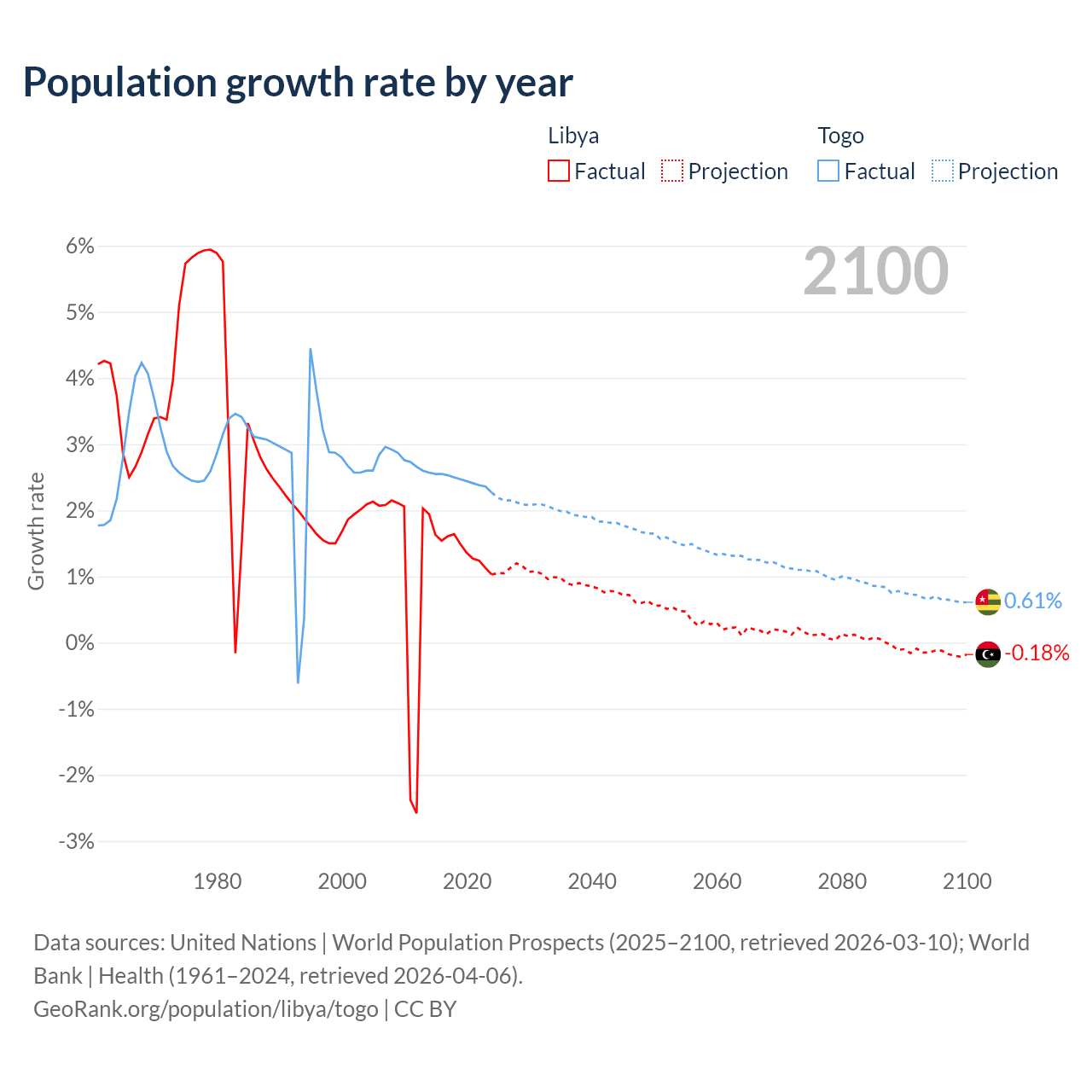 - For the last 10 years, Libya has had an average growth rate of +1.44% per year vs +2.46% in Togo.