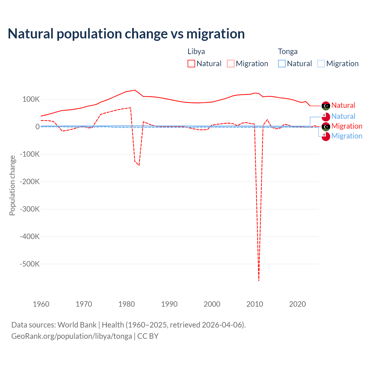 Over the last 10 years, 99.4% of the population change in Libya is from natural causes (a gain of 975,799 people) and 0.63% is from migration (a loss of 6,150 people). In Tonga 46.9% is from natural causes (a gain of 18,919 people) and 53.1% is from migration (a loss of 21,384 people).
