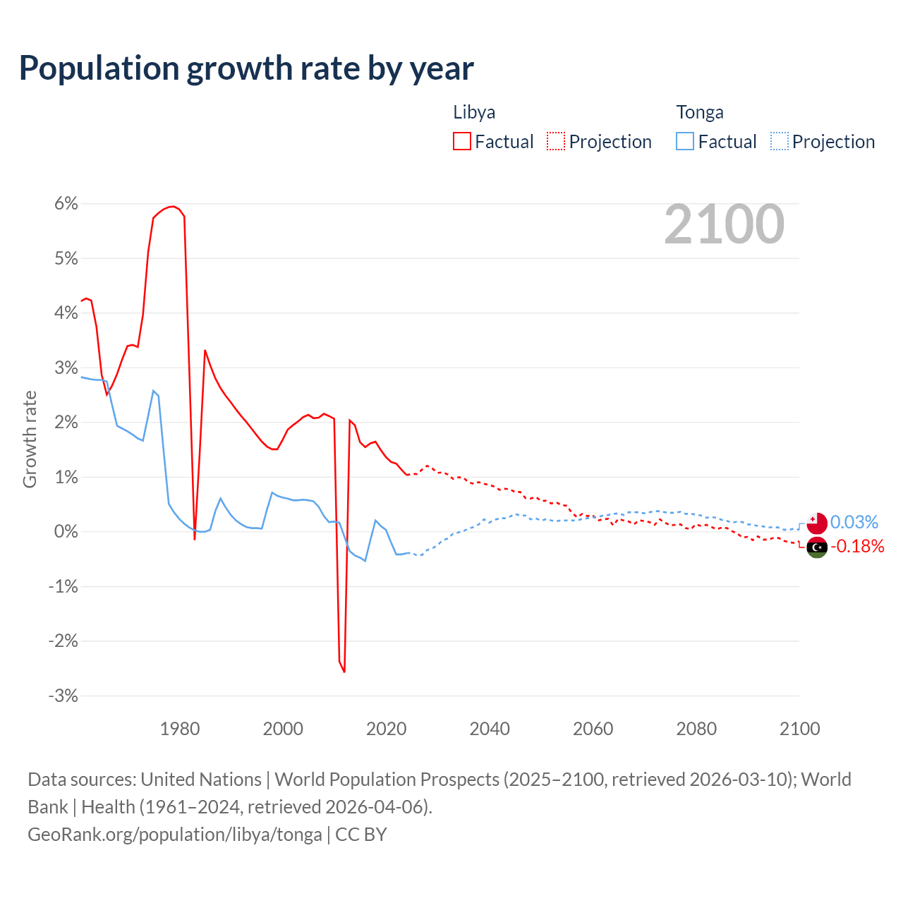 - For the last 10 years, Libya has had an average growth rate of +1.44% per year vs -0.25% in Tonga.
