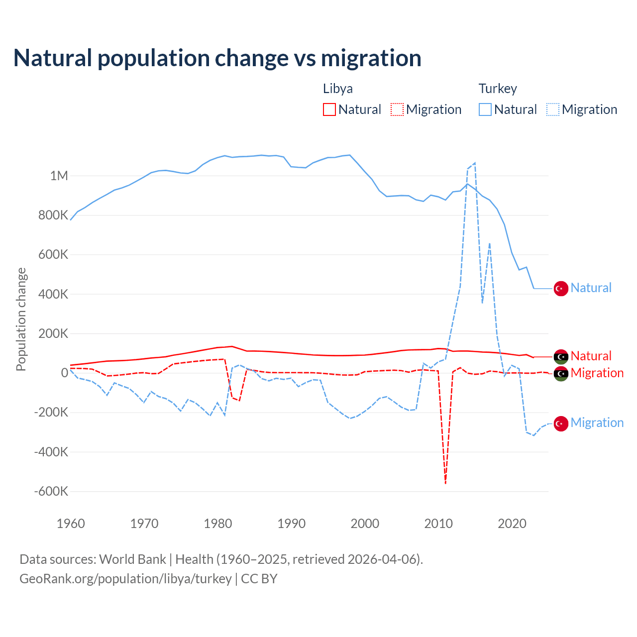 Over the last 10 years, 99.4% of the population change in Libya is from natural causes (a gain of 975,799 people) and 0.63% is from migration (a loss of 6,150 people). In Turkey 73% is from natural causes (a gain of 7,333,352 people) and 27% is from migration (a gain of 2,718,916 people).
